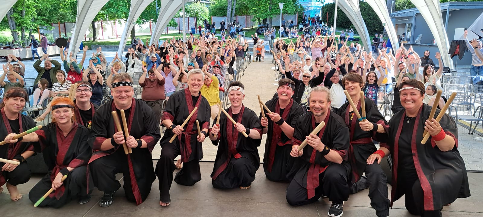 Alle Workshopteilnehmer:innen treten auf und zeigen, was sie gelernt haben. Dazu kommen noch Beiträge von Workshopleiter:innen, Gästen und von Hibiki Daiko e.V..